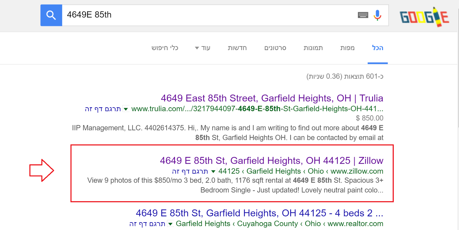 לצורך ההדגמה, ניקח נכס בארה"ב השייך ל-PAZ FUND LLC שכתובתו היא : 4649E 85th, Garfield heights, OH
